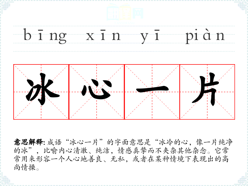 成语“冰心一片”的字面意思是“冰冷的心,像一片纯净的冰”,比喻内心清澈、纯洁,情感真挚而不夹杂其他杂念。它常常用来形容一个人心地善良、无私,或者在某种情境下表现出的高尚情操。