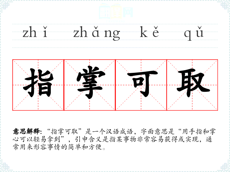 “指掌可取”是一个汉语成语,字面意思是“用手指和掌心可以轻易拿到”,引申含义是指某事物非常容易获得或实现,通常用来形容事情的简单和方便。