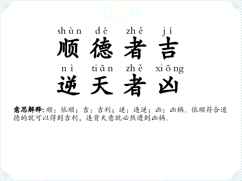 顺:依顺;吉:吉利;逆:违逆;凶:凶祸。依顺符合道德的就可以得到吉利,违背天意就必然遭到凶祸。 |