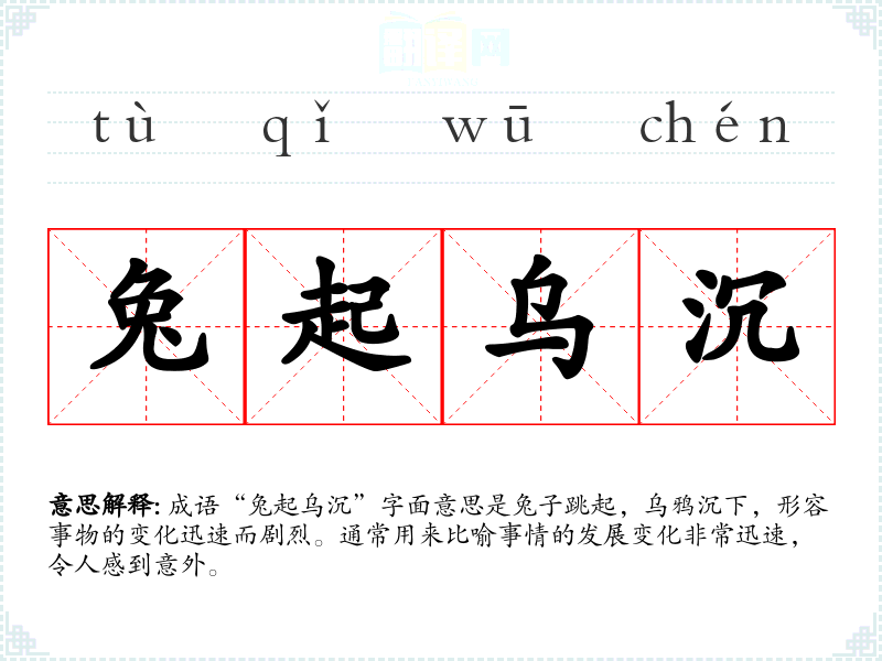 成语“兔起乌沉”字面意思是兔子跳起,乌鸦沉下,形容事物的变化迅速而剧烈。通常用来比喻事情的发展变化非常迅速,令人感到意外。
