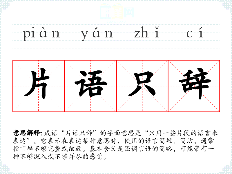 成语“片语只辞”的字面意思是“只用一些片段的语言来表达”。它表示在表达某种意思时,使用的语言简短、简洁,通常指言辞不够完整或细致。基本含义是强调言语的简略,可能带有一种不够深入或不够详尽的感觉。