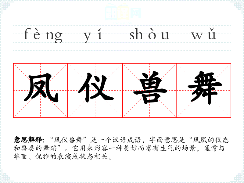 “凤仪兽舞”是一个汉语成语,字面意思是“凤凰的仪态和兽类的舞蹈”。它用来形容一种美妙而富有生气的场景,通常与华丽、优雅的表演或状态相关。
