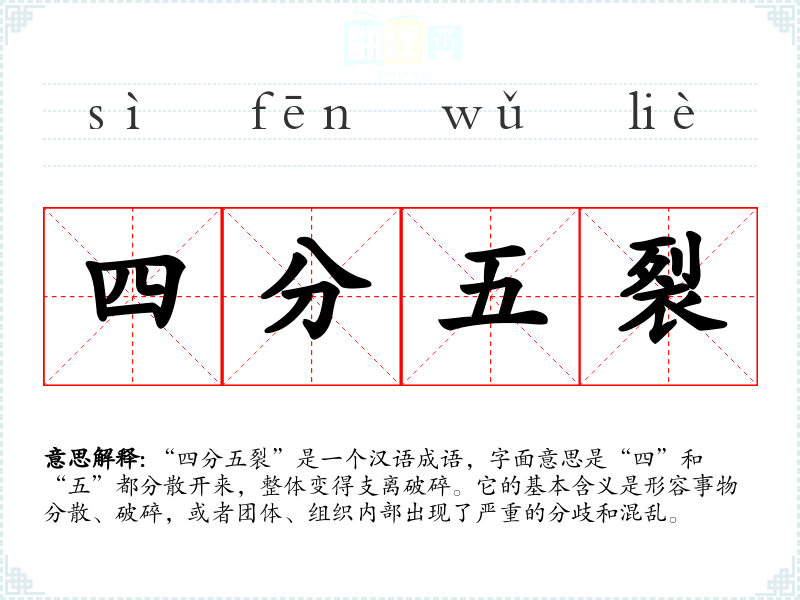 “四分五裂”是一个汉语成语,字面意思是“四”和“五”都分散开来,整体变得支离破碎。它的基本含义是形容事物分散、破碎,或者团体、组织内部出现了严重的分歧和混乱。
