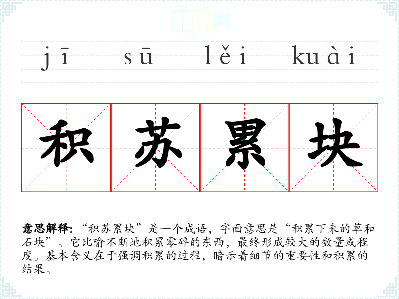 “积苏累块”是一个成语,字面意思是“积累下来的草和石块”。它比喻不断地积累零碎的东西,最终形成较大的数量或程度。基本含义在于强调积累的过程,暗示着细节的重要性和积累的结果。