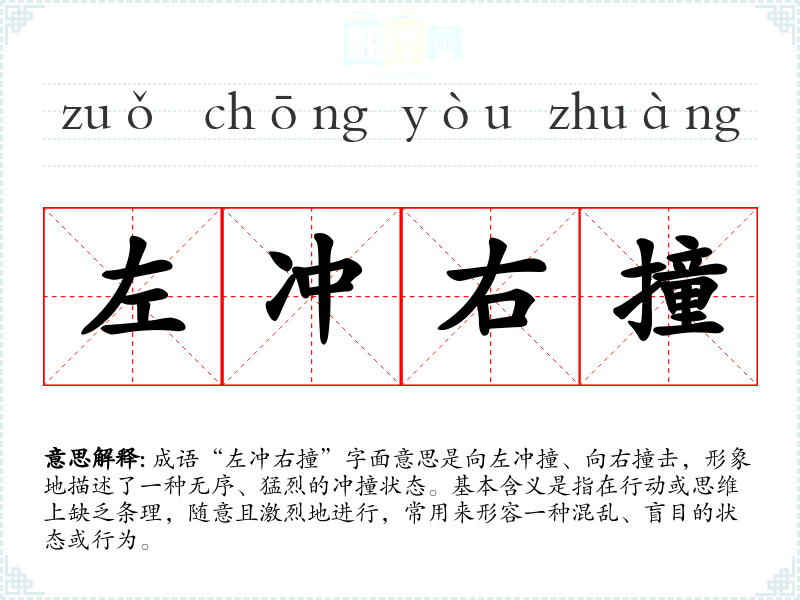 “左冲右撞”并没有特定的历史典故或文学出处,它是一种形象的比喻,通常用来描述一种混乱的情景。这种表达方式在口语和书面语中都较为常见,反映了古汉语中对方位和冲撞动作的描绘。