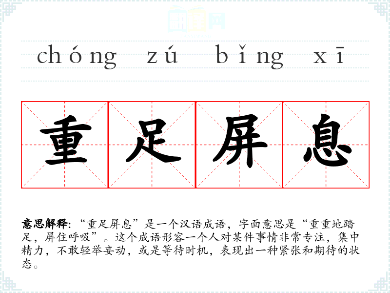 “重足屏息”是一个汉语成语,字面意思是“重重地踏足,屏住呼吸”。这个成语形容一个人对某件事情非常专注,集中精力,不敢轻举妄动,或是等待时机,表现出一种紧张和期待的状态。