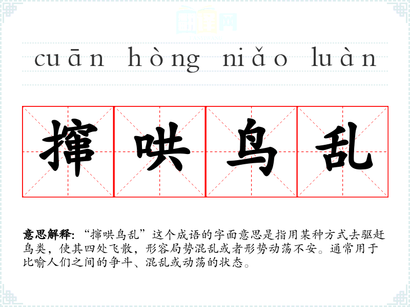“撺哄鸟乱”这个成语的字面意思是指用某种方式去驱赶鸟类,使其四处飞散,形容局势混乱或者形势动荡不安。通常用于比喻人们之间的争斗、混乱或动荡的状态。