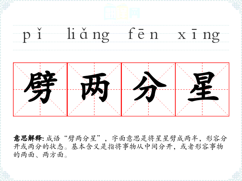 成语“劈两分星”,字面意思是将星星劈成两半,形容分开或两分的状态。基本含义是指将事物从中间分开,或者形容事物的两面、两方面。