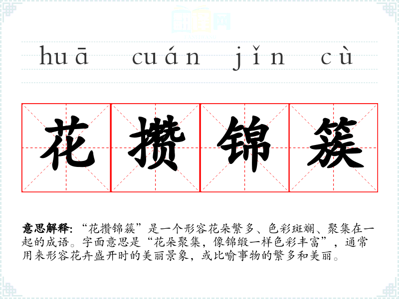 “花攒锦簇”是一个形容花朵繁多、色彩斑斓、聚集在一起的成语。字面意思是“花朵聚集,像锦缎一样色彩丰富”,通常用来形容花卉盛开时的美丽景象,或比喻事物的繁多和美丽。