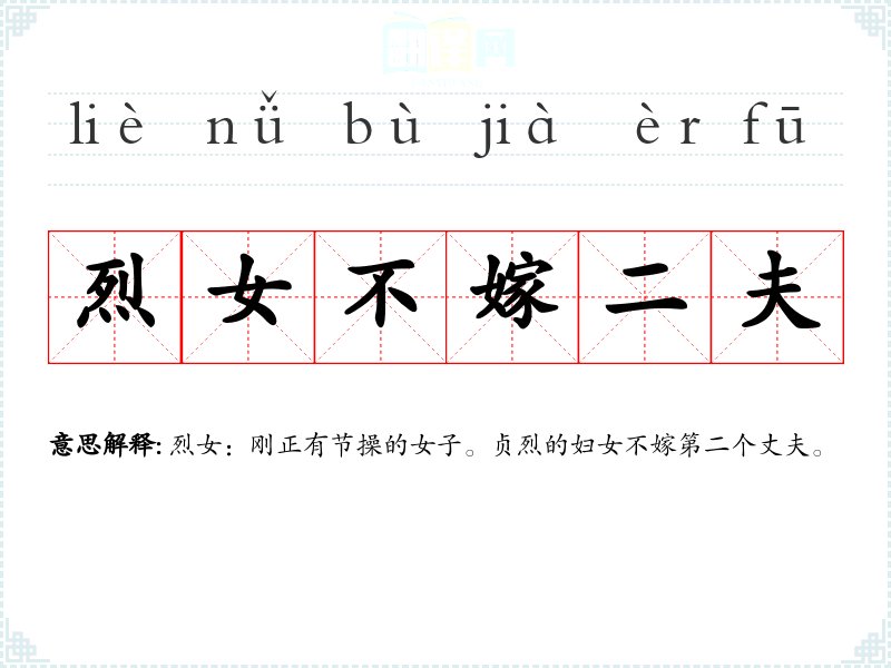 烈女:刚正有节操的女子。贞烈的妇女不嫁第二个丈夫。 |