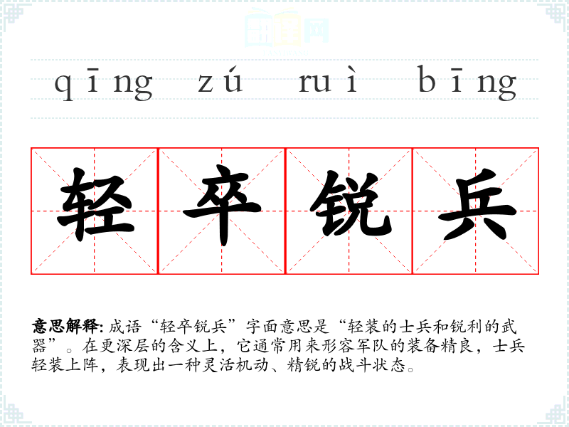 成语“轻卒锐兵”字面意思是“轻装的士兵和锐利的武器”。在更深层的含义上,它通常用来形容军队的装备精良,士兵轻装上阵,表现出一种灵活机动、精锐的战斗状态。