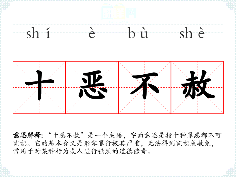 | 十恶不赦 | 指罪恶极大,不可饶恕。 |