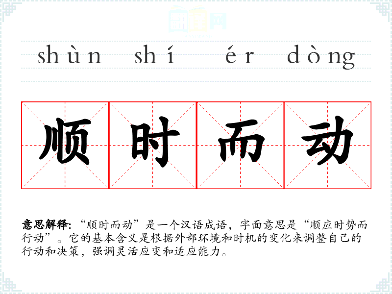 “顺时而动”是一个汉语成语,字面意思是“顺应时势而行动”。它的基本含义是根据外部环境和时机的变化来调整自己的行动和决策,强调灵活应变和适应能力。