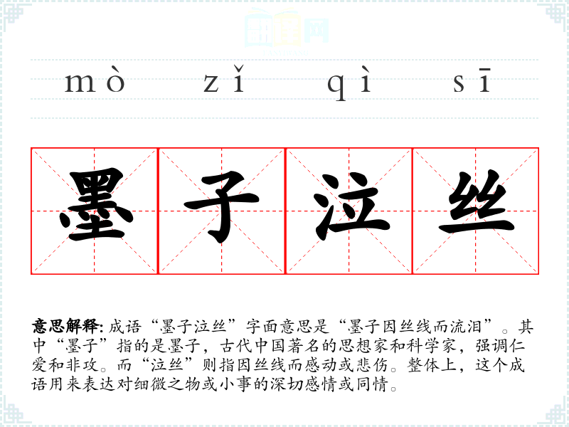 “墨子泣丝”源于墨子的故事。相传墨子在路上看到一位母亲因失去一根丝线而悲痛不已,感受到这种微小的悲伤,竟然也为之流泪。这个故事传达了墨子的仁爱情怀,强调了对他人情感的敏感和理解。