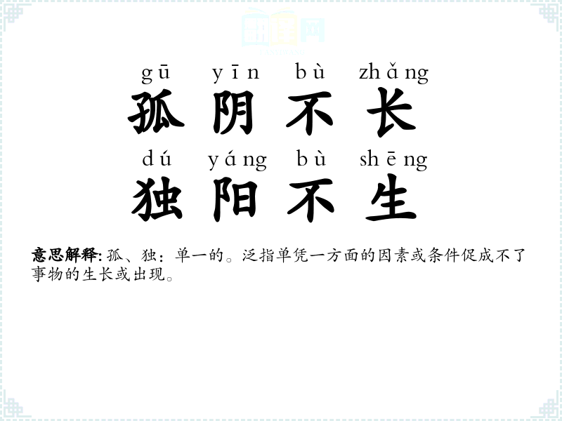 阴、阳:指事物矛盾的两个对立面;道:事物发展的规律。既有阴,又有阳,这就是道,即事物发展的规律。 |