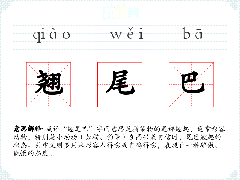 - 得意扬扬:形容得意时的样子,和“翘尾巴”的含义相似。