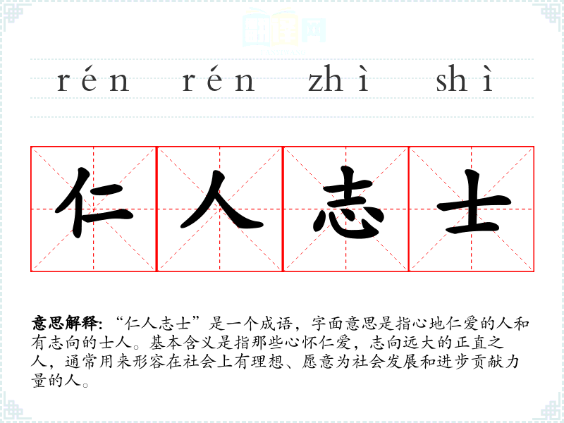 | 仁人志士 | 原指仁爱而有节操,能为正义牺牲生命的人。现在泛指爱国而为革命事业出力的人。 |