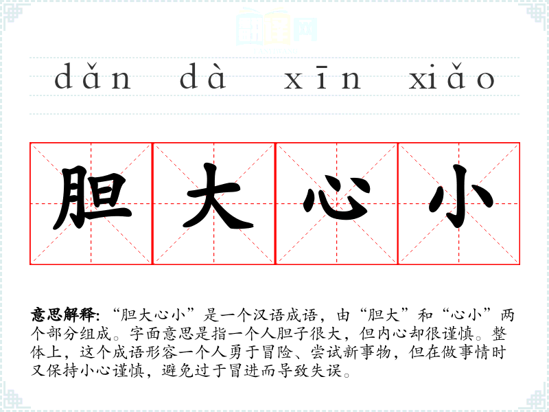 “胆大心小”是一个汉语成语,由“胆大”和“心小”两个部分组成。字面意思是指一个人胆子很大,但内心却很谨慎。整体上,这个成语形容一个人勇于冒险、尝试新事物,但在做事情时又保持小心谨慎,避免过于冒进而导致失误。