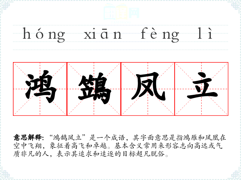 “鸿鹄凤立”是一个成语,其字面意思是指鸿雁和凤凰在空中飞翔,象征着高飞和卓越。基本含义常用来形容志向高远或气质非凡的人,表示其追求和追逐的目标超凡脱俗。