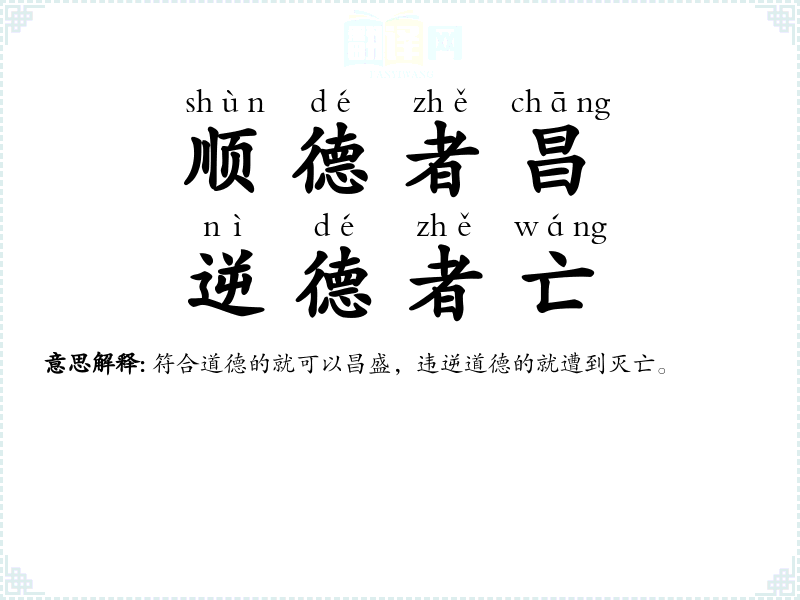 顺:顺从;昌:昌盛;逆:违背;亡:灭亡。顺应民众的就能兴旺,违逆民众的定要衰亡。 |