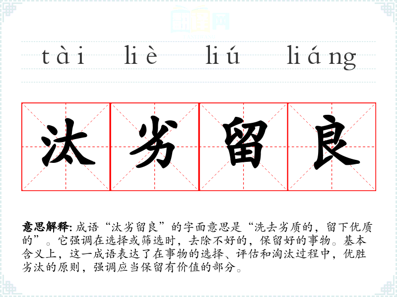 成语“汰劣留良”的字面意思是“洗去劣质的,留下优质的”。它强调在选择或筛选时,去除不好的,保留好的事物。基本含义上,这一成语表达了在事物的选择、评估和淘汰过程中,优胜劣汰的原则,强调应当保留有价值的部分。