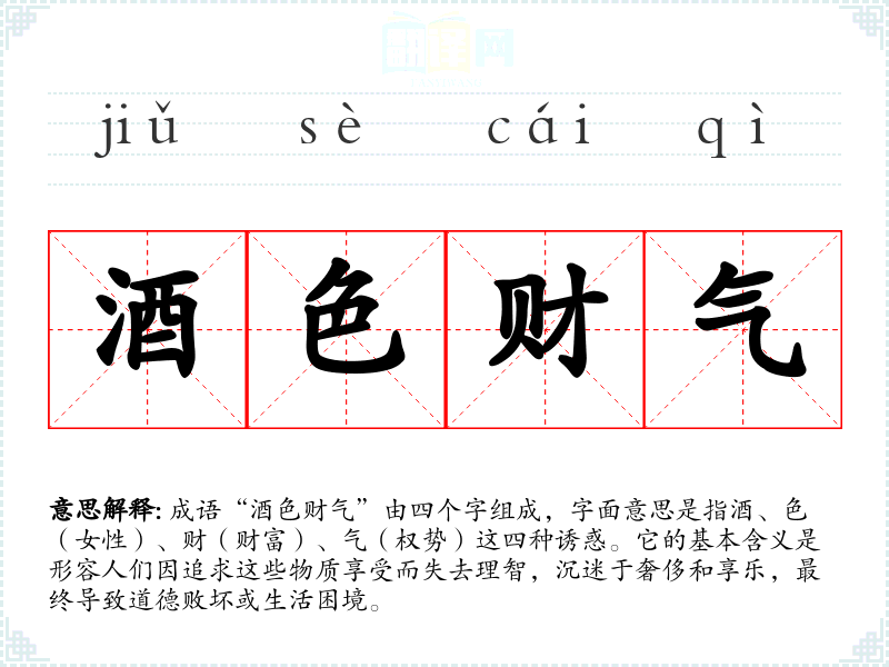 成语“酒色财气”由四个字组成,字面意思是指酒、色(女性)、财(财富)、气(权势)这四种诱惑。它的基本含义是形容人们因追求这些物质享受而失去理智,沉迷于奢侈和享乐,最终导致道德败坏或生活困境。