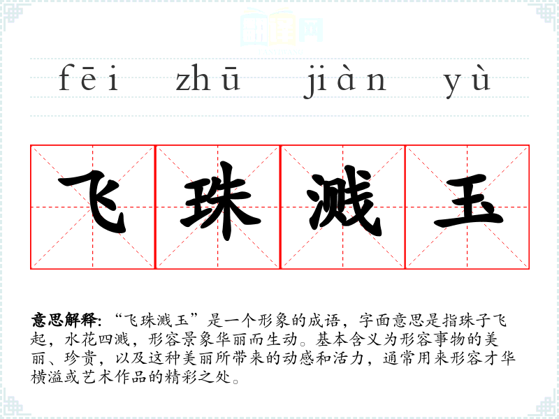 “飞珠溅玉”给人一种生动、活泼的感觉,让人联想到艺术的灵动与自然的美好。这种形象使我在表达美好事物时更加生动,更能吸引听众的注意力。