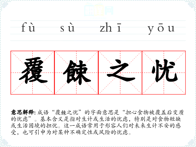 成语“覆餗之忧”的字面意思是“担心食物被覆盖后变质的忧虑”。基本含义是指对生计或生活的忧虑,特别是对食物短缺或生活困境的担忧。这一成语常用于形容人们对未来生计不安的感受,也可引申为对某种不确定性或风险的忧虑。