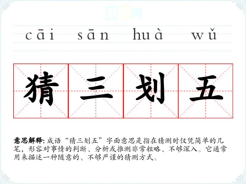 成语“猜三划五”字面意思是指在猜测时仅凭简单的几笔,形容对事情的判断、分析或推测非常粗略、不够深入。它通常用来描述一种随意的、不够严谨的猜测方式。