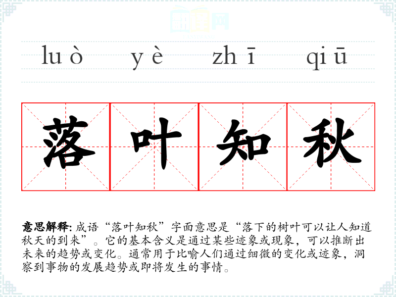成语“落叶知秋”字面意思是“落下的树叶可以让人知道秋天的到来”。它的基本含义是通过某些迹象或现象,可以推断出未来的趋势或变化。通常用于比喻人们通过细微的变化或迹象,洞察到事物的发展趋势或即将发生的事情。