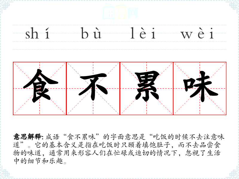成语“食不累味”的字面意思是“吃饭的时候不去注意味道”。它的基本含义是指在吃饭时只顾着填饱肚子,而不去品尝食物的味道,通常用来形容人们在忙碌或迫切的情况下,忽视了生活中的细节和乐趣。