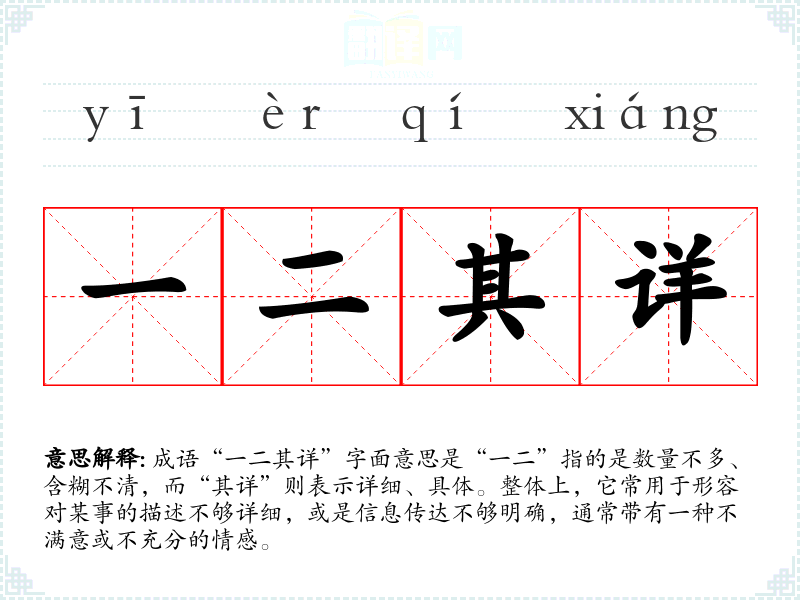 成语“一二其详”字面意思是“一二”指的是数量不多、含糊不清,而“其详”则表示详细、具体。整体上,它常用于形容对某事的描述不够详细,或是信息传达不够明确,通常带有一种不满意或不充分的情感。