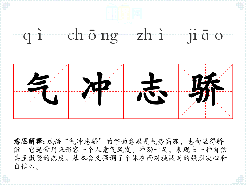 成语“气冲志骄”的字面意思是气势高涨,志向显得骄傲。它通常用来形容一个人意气风发、冲劲十足,表现出一种自信甚至傲慢的态度。基本含义强调了个体在面对挑战时的强烈决心和自信心。
