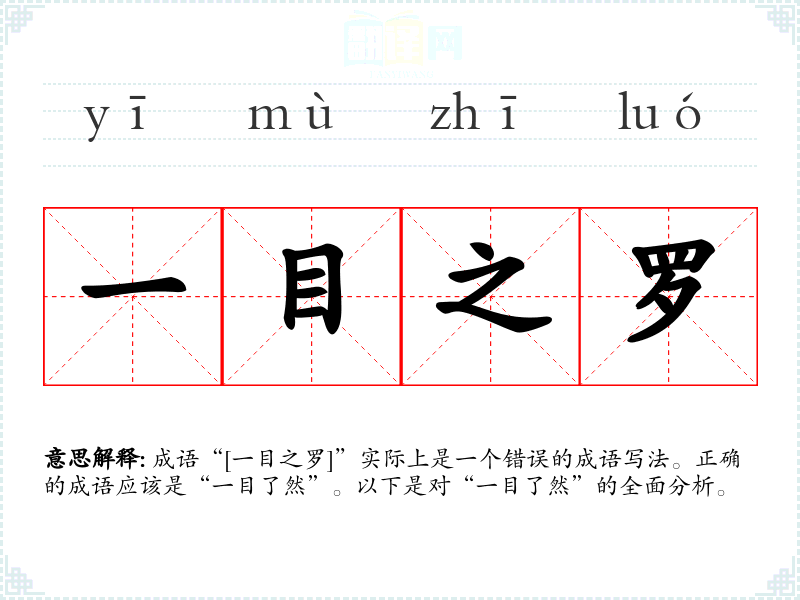 成语“[一目之罗]”实际上是一个错误的成语写法。正确的成语应该是“一目了然”。以下是对“一目了然”的全面分析。