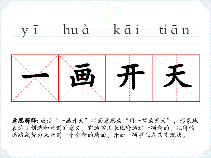 成语“一画开天”字面意思为“用一笔画开天”,形象地表达了创造和开创的意义。它通常用来比喻通过一项新的、独特的思路或努力来开创一个全新的局面、开始一项事业或改变现状。
