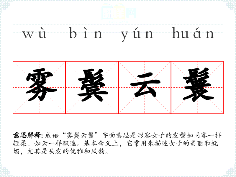 成语“雾鬓云鬟”字面意思是形容女子的发髻如同雾一样轻柔、如云一样飘逸。基本含义上,它常用来描述女子的美丽和妩媚,尤其是头发的优雅和风韵。