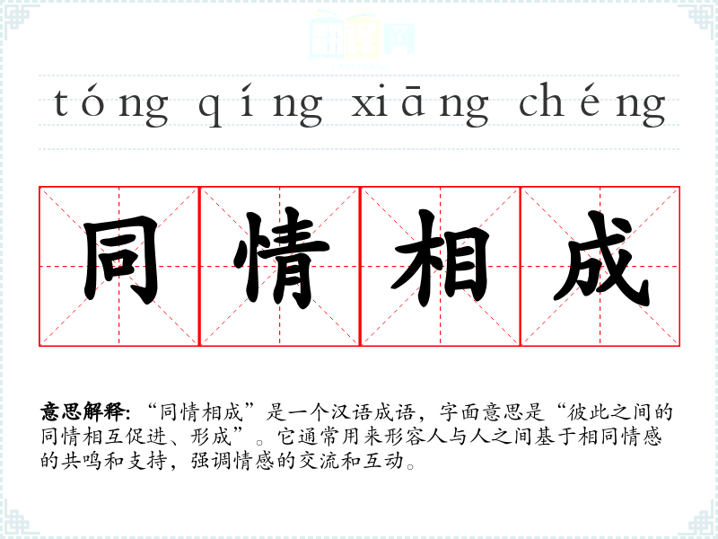 “同情相成”是一个汉语成语,字面意思是“彼此之间的同情相互促进、形成”。它通常用来形容人与人之间基于相同情感的共鸣和支持,强调情感的交流和互动。