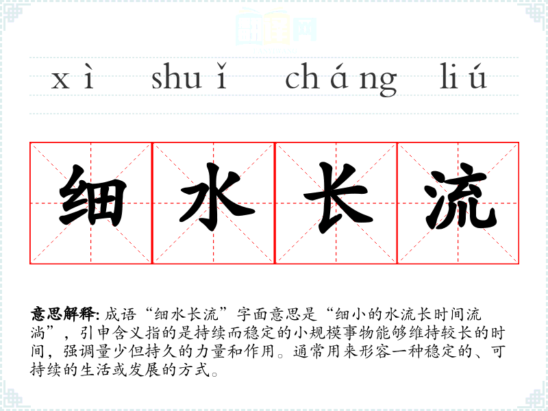 成语“细水长流”字面意思是“细小的水流长时间流淌”,引申含义指的是持续而稳定的小规模事物能够维持较长的时间,强调量少但持久的力量和作用。通常用来形容一种稳定的、可持续的生活或发展的方式。