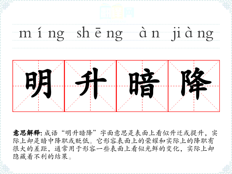 成语“明升暗降”字面意思是表面上看似升迁或提升,实际上却是暗中降职或贬低。它形容表面上的荣耀和实际上的降职有很大的差距,通常用于形容一些表面上看似光鲜的变化,实际上却隐藏着不利的结果。