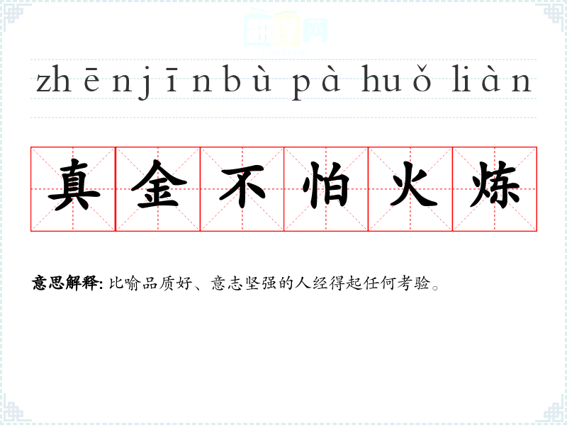 | 真金不怕火炼 | 比喻品质好、意志坚强的人经得起任何考验。 |