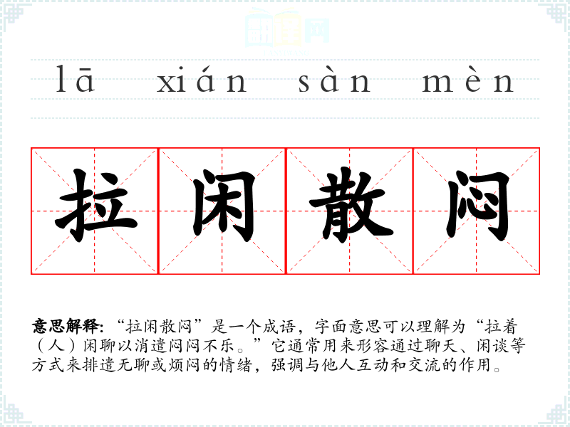 “拉闲散闷”是一个成语,字面意思可以理解为“拉着(人)闲聊以消遣闷闷不乐。”它通常用来形容通过聊天、闲谈等方式来排遣无聊或烦闷的情绪,强调与他人互动和交流的作用。