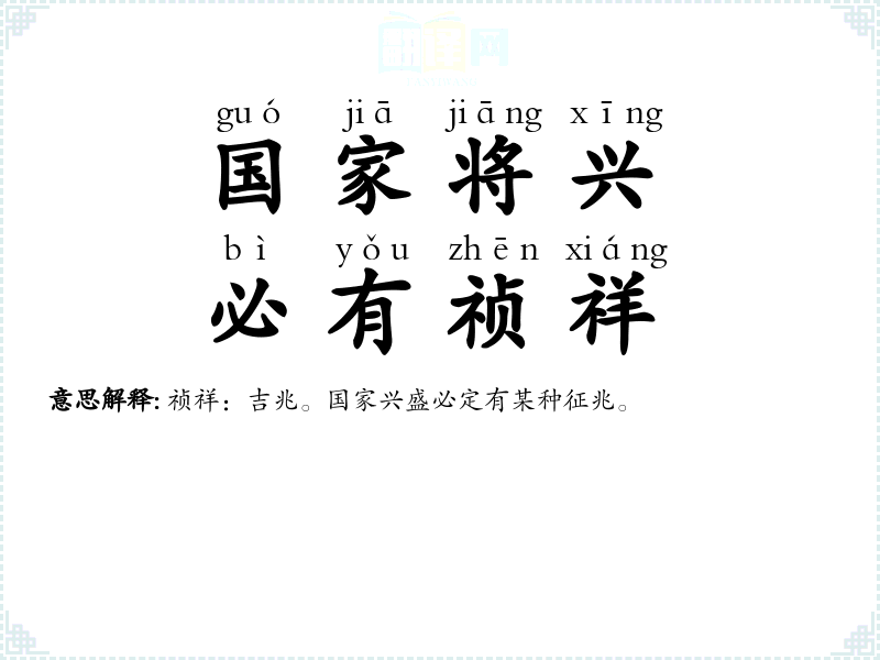 祯祥:吉兆。国家兴盛必定有某种征兆。 |