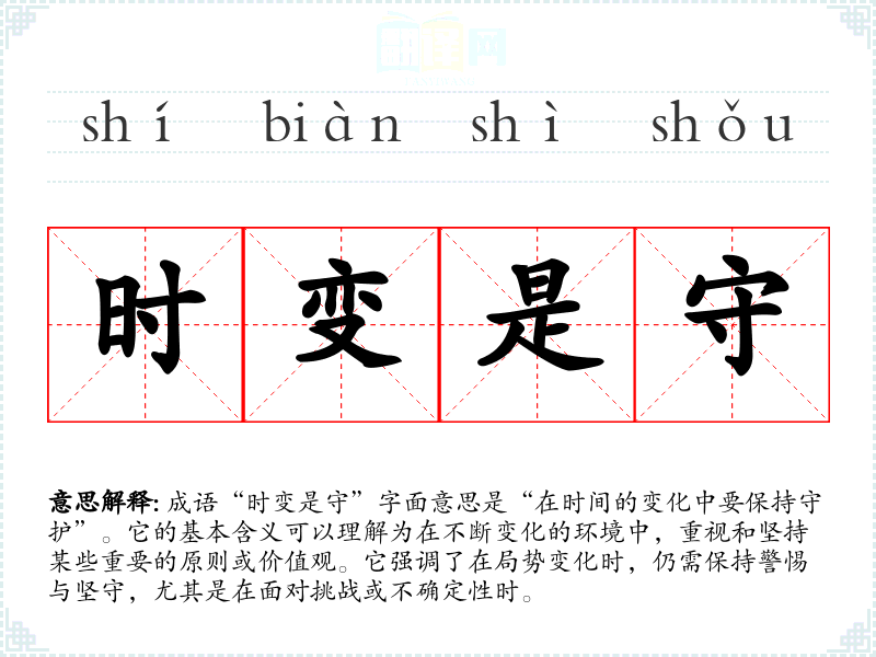 “时变是守”并不是一个传统的成语,可能是现代人对传统成语的变形或新的表达。它的构成部分“时变”指时间和环境的变化,而“守”则强调了坚持和保护的意义。这样的表达可以追溯到**古代对变化与稳定之间的哲学思考,尤其是道家和儒家思想中对和谐与变化的看法。