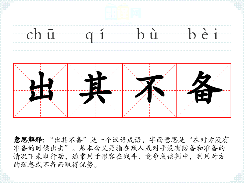 出其不意,攻其无备 原指出兵攻击对方不防备的地方。后亦指行动出乎人的意料。