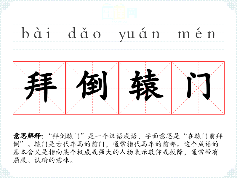 “拜倒辕门”通常用于描述个人或集体对某种权威、力量或能力的尊重与顺从。在文学作品中,该成语常出现于描写战争、权力斗争或忠诚与背叛的场景。在日常对话中,可以用来形容某人对他人的崇拜或顺从。