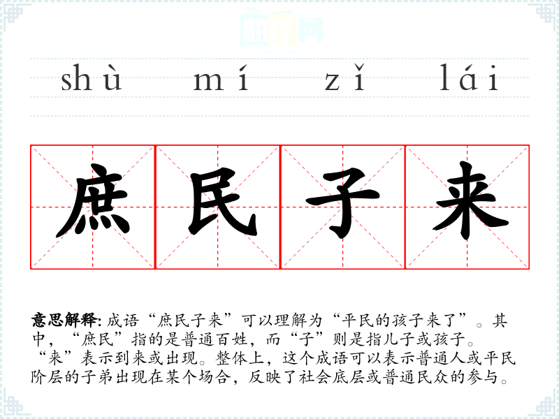 成语“庶民子来”可以理解为“平民的孩子来了”。其中,“庶民”指的是普通百姓,而“子”则是指儿子或孩子。“来”表示到来或出现。整体上,这个成语可以表示普通人或平民阶层的子弟出现在某个场合,反映了社会底层或普通民众的参与。
