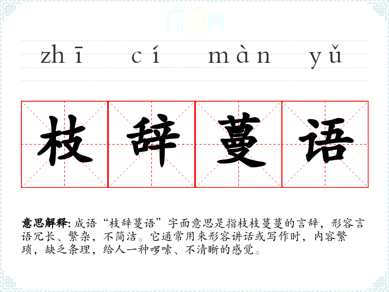 成语“枝辞蔓语”字面意思是指枝枝蔓蔓的言辞,形容言语冗长、繁杂,不简洁。它通常用来形容讲话或写作时,内容繁琐,缺乏条理,给人一种啰嗦、不清晰的感觉。