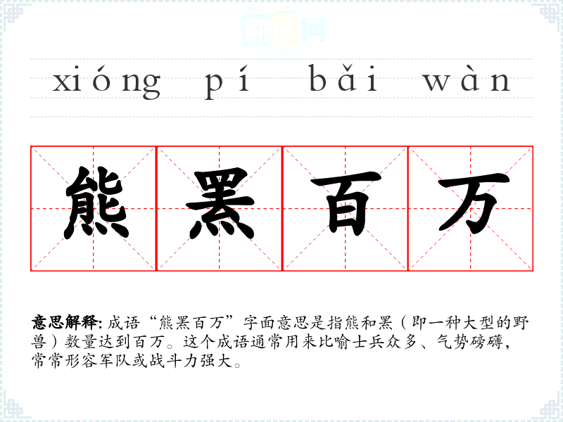 - 军事场合:在描述军队的规模、力量时,可以使用“熊罴百万”来形容其强大。