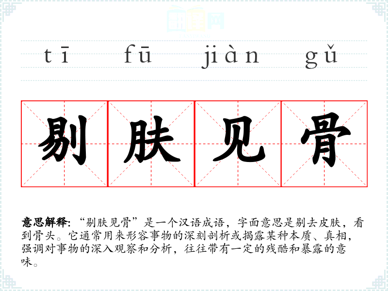 这个成语的来源并不明确,但可以推测它反映了古代对身体和内在本质的理解。在古代文化中,皮肤和骨骼常常被用来象征外在和内在,剔去外层意味着对内在的深刻洞察。在文学作品中,类似的比喻常见于一些古典诗词和散文中,表达对人性、社会或事物本质的探讨。
