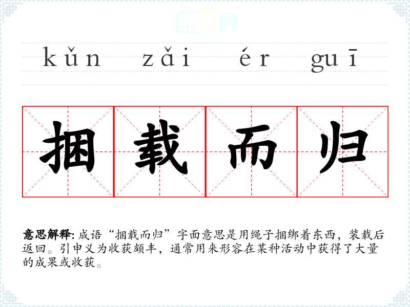成语“捆载而归”字面意思是用绳子捆绑着东西,装载后返回。引申义为收获颇丰,通常用来形容在某种活动中获得了大量的成果或收获。